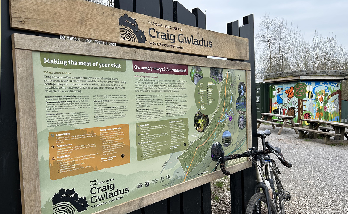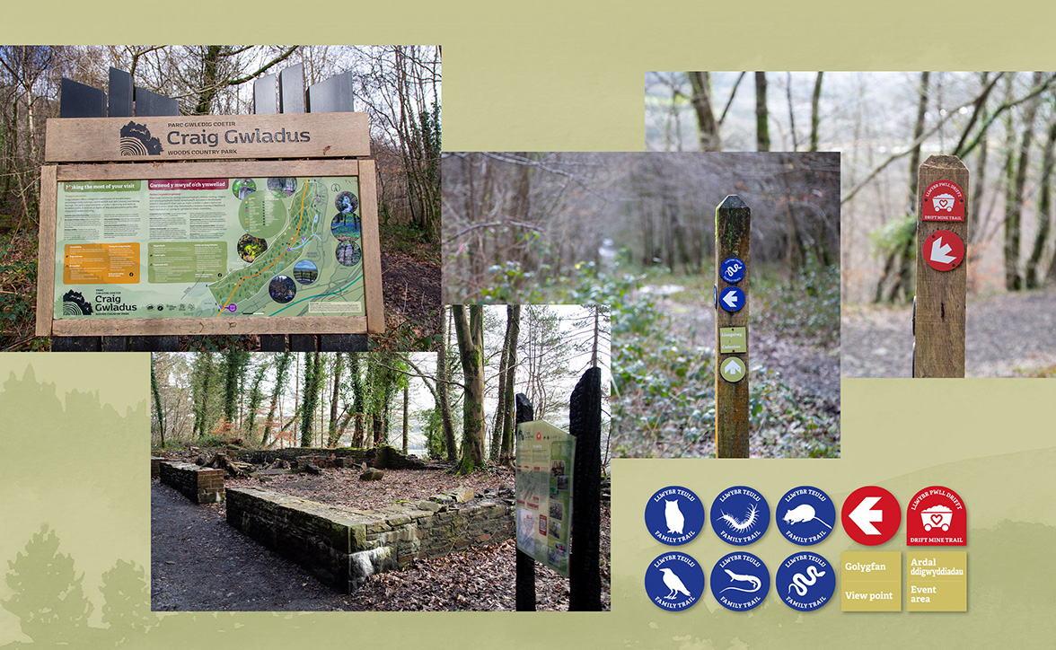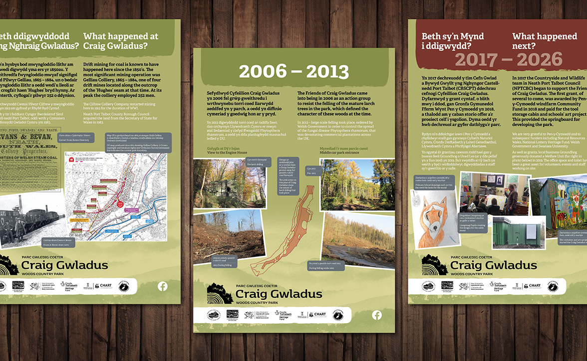 Nestled in the picturesque Neath Valley and linked by a network of around 9km footpaths, Craig Gwladus is a delightful combination of thickly wooded slopes, picturesque rocky outcrops, varied wildlife habitats and coal-mining heritage. We worked alongside the enthusiastic project & site manager Lisa Kirman to develop the identity and appeal of this historic site. This long term project has included branding, interpretation boards & display structures, heritage and family trail way marking and community engagement display boards.